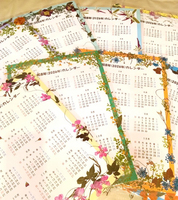 ご自宅に咲いた色とりどりのお花を使って丁寧に作られた押し花を、カレンダーの上にバランスよく配置し、ラミネートで仕上げられた、まさに一枚一枚が世界にひとつだけの特別なカレンダーです