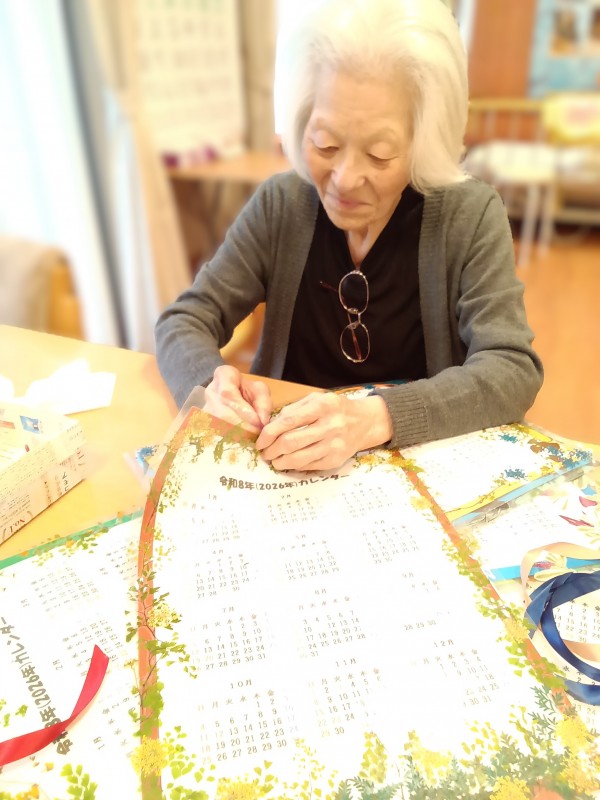 カレンダーを吊るすリボンをご入居者様に選んでつけて頂きました