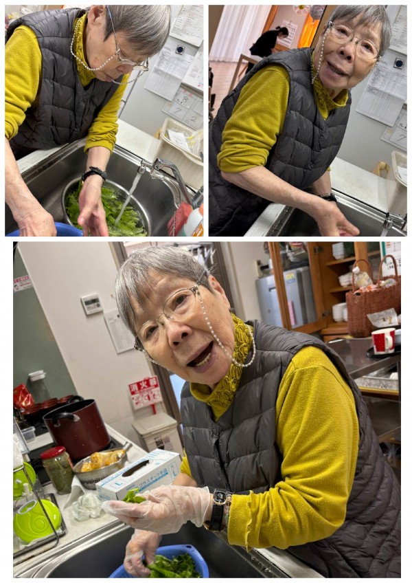 キッチンで丁寧にレタスを洗いながら「このくらいでいいかな??綺麗だね」職員と会話を楽しみながら手際よく作業を進めて下さりました!