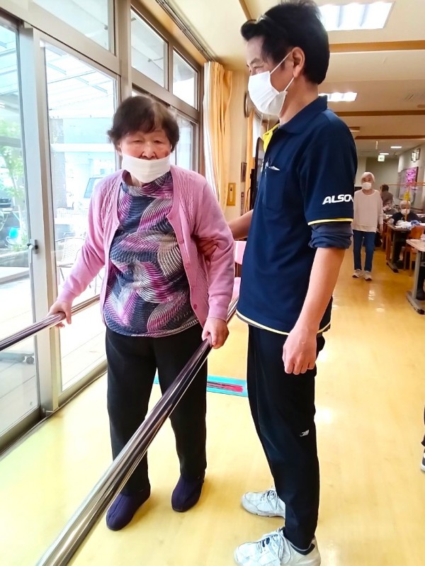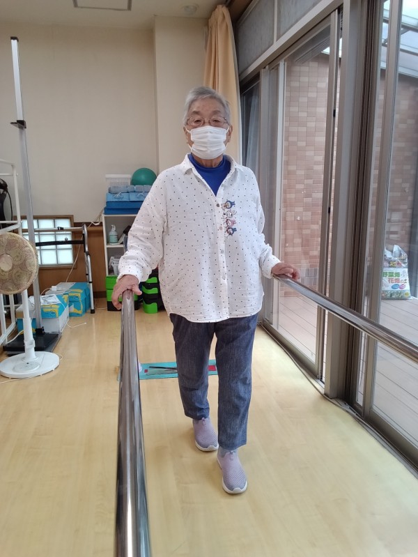 「膝が弱くて立ち上がりのときにふらつくから、ふらつきなくしっかりと立ち上がれるようにしたい。」【平行棒内歩行運動】