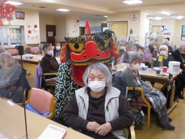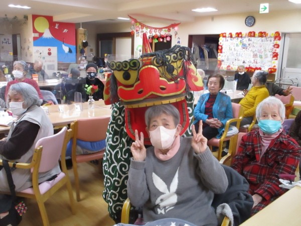 まずは獅子舞の登場です。「頭をかじってもらうと無病息災」と言われている獅子舞に、ご利用者様お一人おひとり、順番に頭をかじってもらいました。