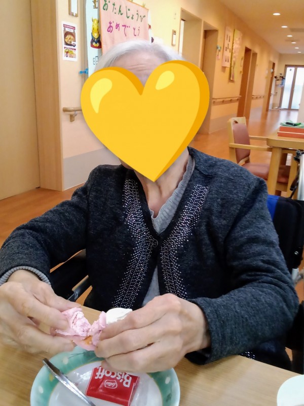 毎月のようにお誕生会がありますが、いくつになっても皆さん嬉しいようで、男性の方でもとても喜んでケーキを召し上がって下さいました。