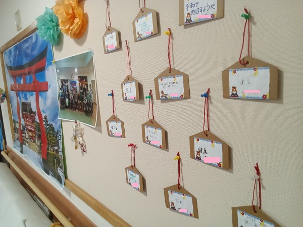 職員お手製の絵馬に、ご利用者様みなさんの今年の抱負や願い事を書いていただきました。
