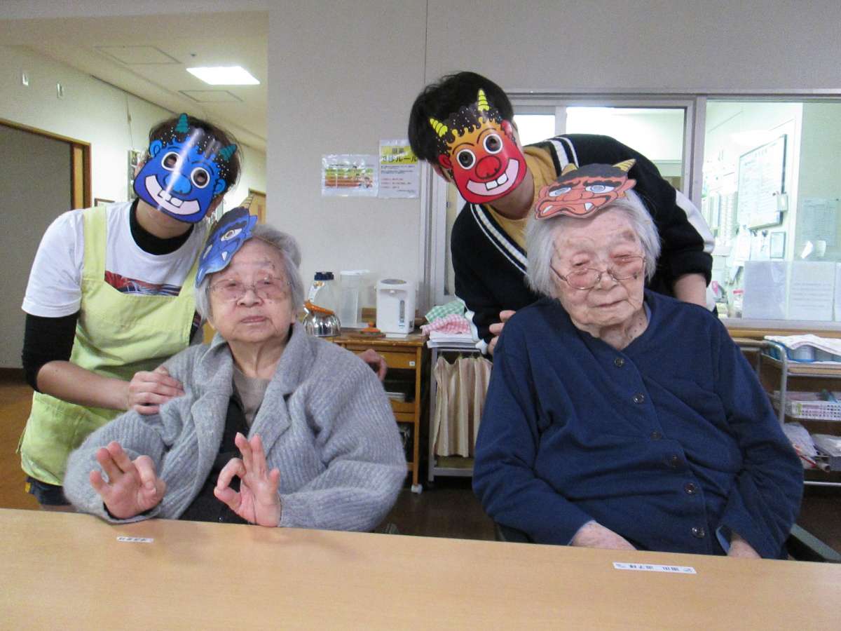 皆さんで新聞紙を丸めた豆を投げて 鬼退治です!!