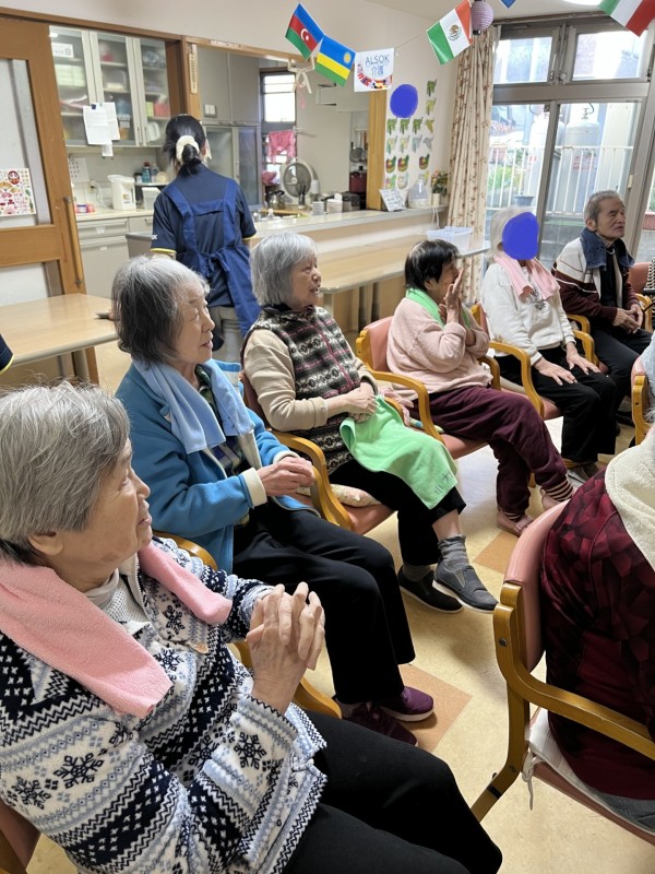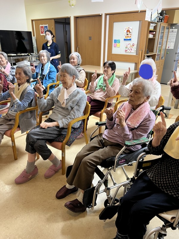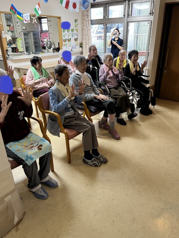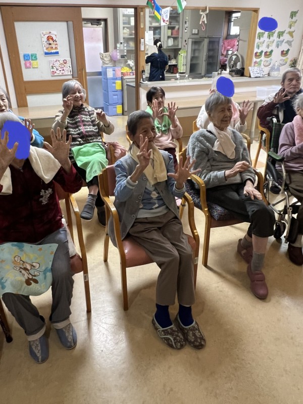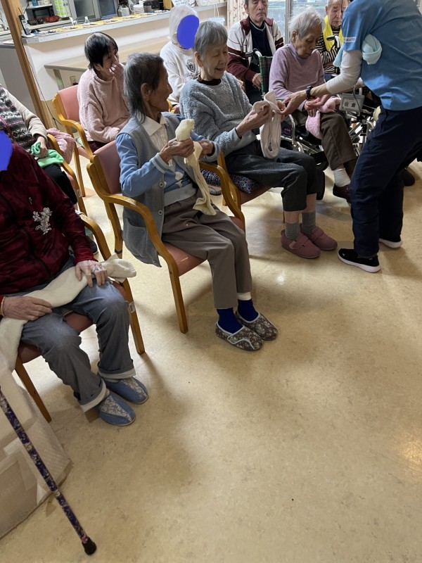 今回は1、2階合同で運動指導員による「訪問運動教室」のタオル体操を行いましたので、