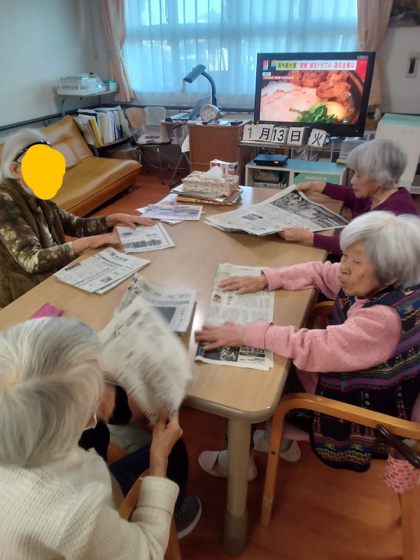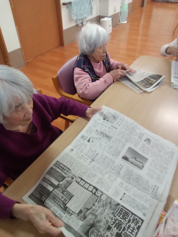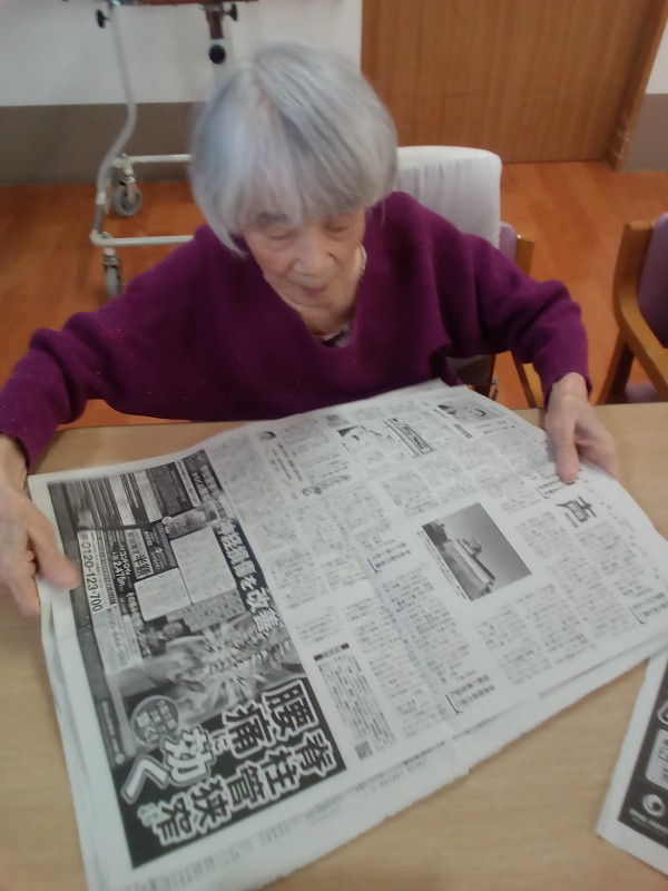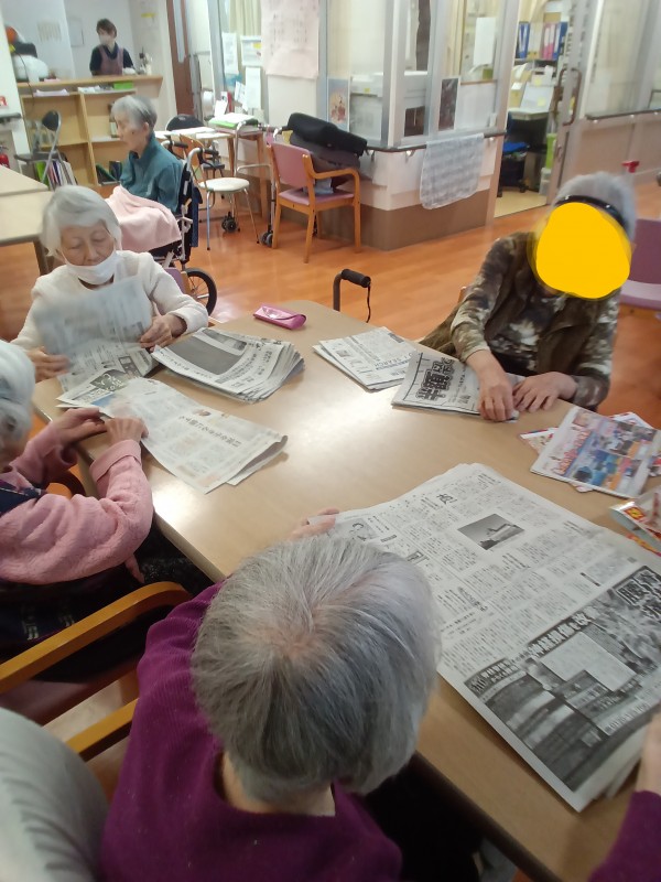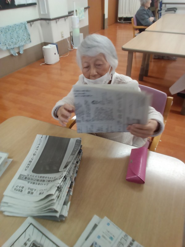以前のブログでは洗濯物たたみと床のお掃除をご紹介しましたが、今回は新聞紙の折りたたみをご利用者の皆さんにお願いいたしました。それではその時の様子をご覧ください(^^♪
