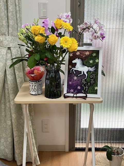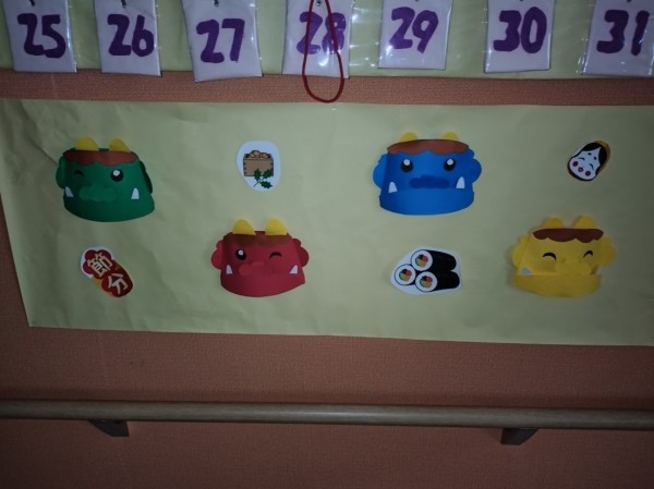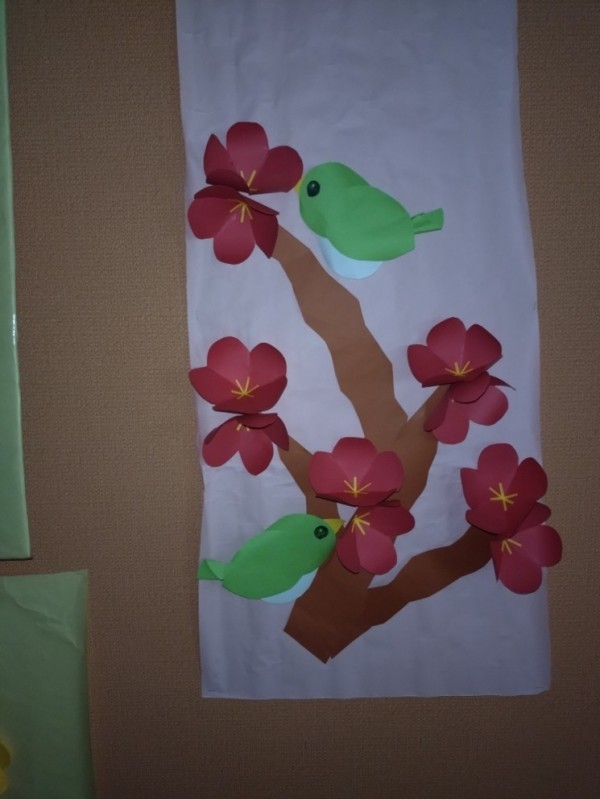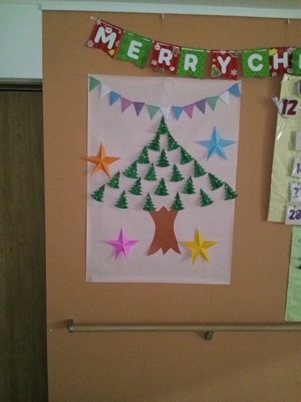 風が冷たく外気浴も出来ないので壁の飾りで季節を感じて頂いてます。