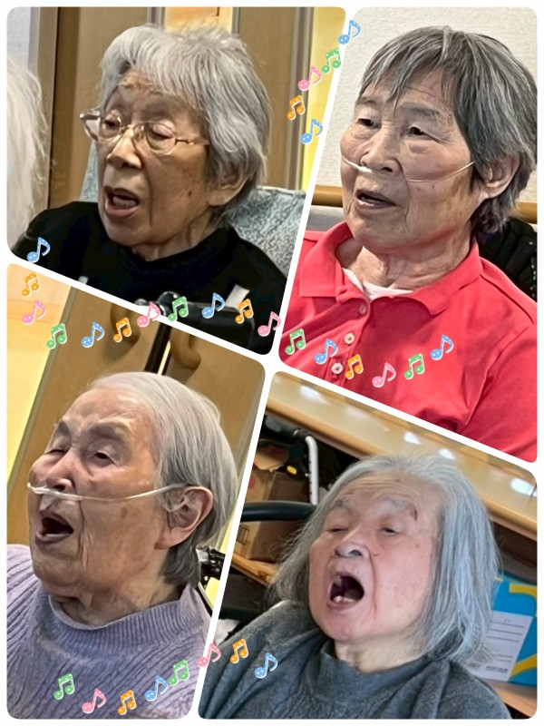 歌うことで口腔機能が向上、体も動かすのでほどよい疲れが昼と夜のリズムを作ります。歌詞を追ったり、懐かしい思い出がよみがえり脳への刺激に!