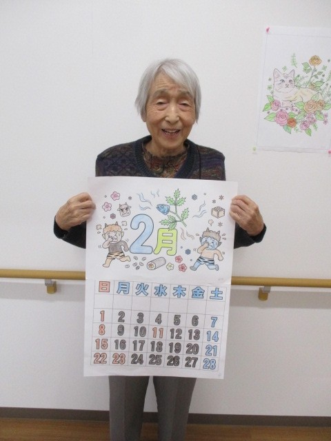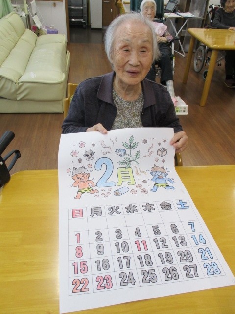 2月のカレンダーを作っているご様子です( ^ω^)・・・ 赤鬼・青鬼の節分の絵も上手に塗られていますね??