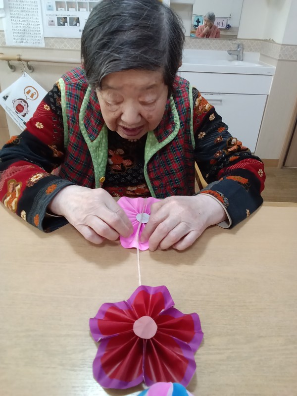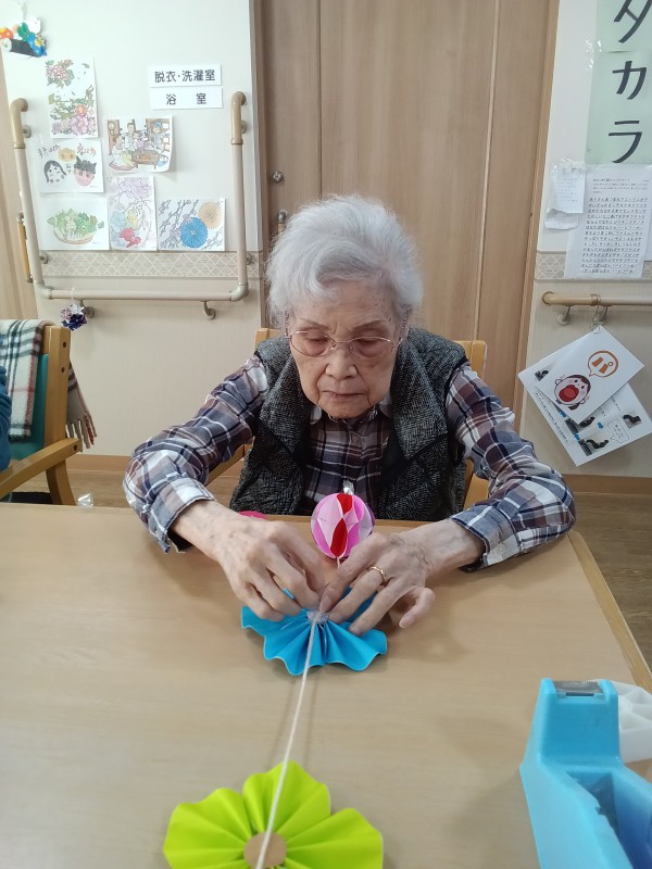 皆様に作っていただいたいろいろな飾りを紐でつなげました。
