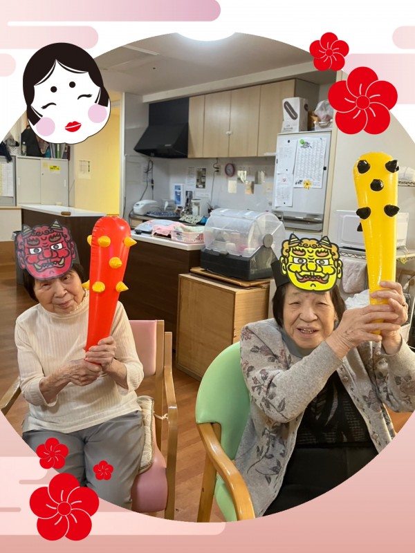 鬼のお面と金棒を手に、写真を撮りました(^^)