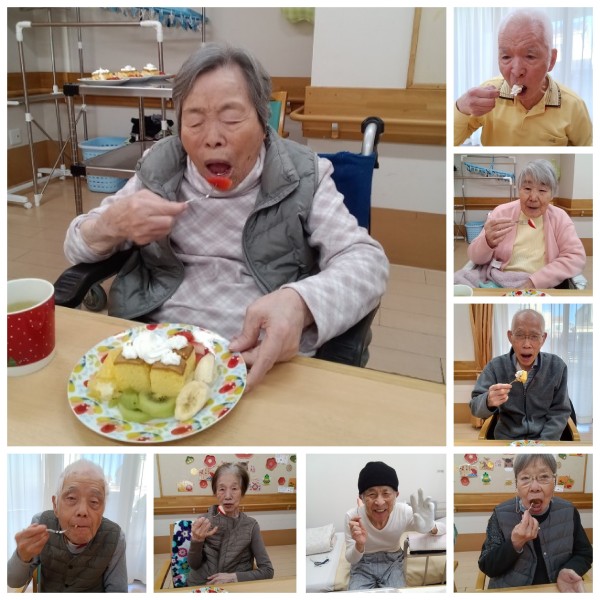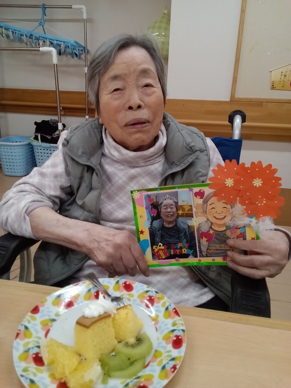 ふんわりカステラにフルーツ、生クリームを添えてお誕生日のお祝いを致しました^^