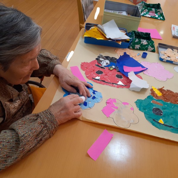 折り紙をちぎり、のり付けをして