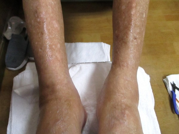 こちらのご利用者様は、普段は車いすで過ごされることが多く、長時間座ったまま、または横になって過ごされる生活が続いています。そのため、足のむくみが強く、靴下の跡がくっきり残り、でこぼこしてしまうほどの状態でした。