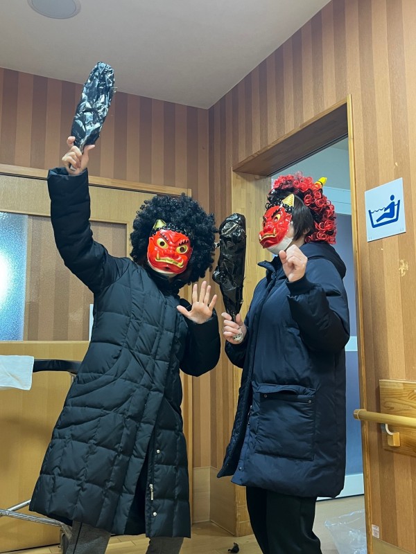スタッフ2名が鬼の衣装に身を包み、迫力を出す為黒いダウンを着て登場しました。