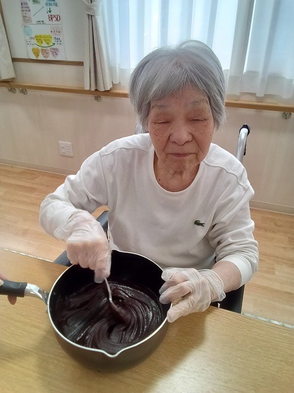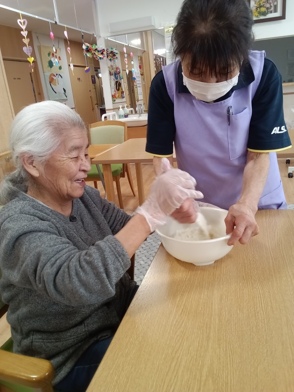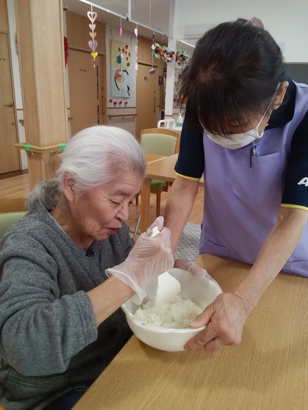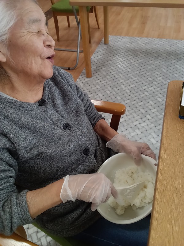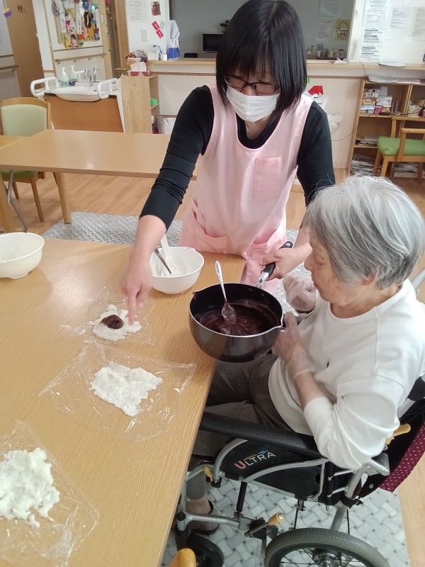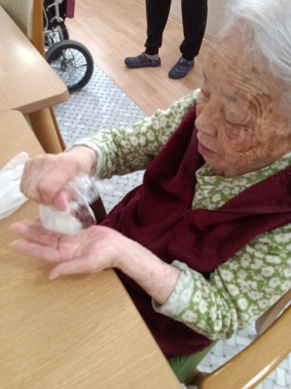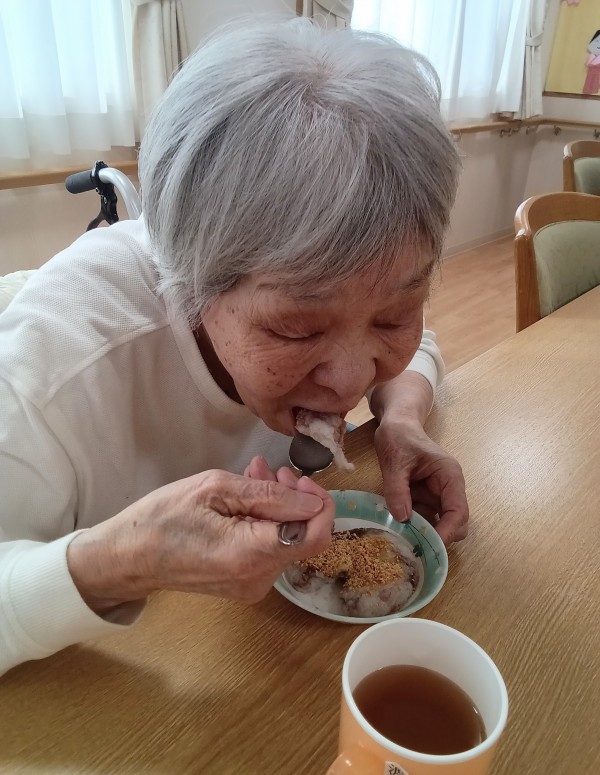 2回目…つぶしたご飯にあんこをのせて包み、自家製きな粉をまぶしておはぎの出来上がり\(^o^)/