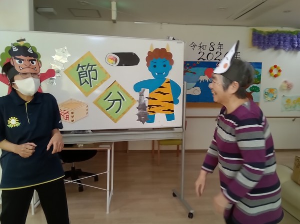 2月と言えば節分。 無病息災を願う伝統行事、みんなの家たかしなでも「鬼は外!福は内!」と掛け声をかけ鬼に扮した職員を追い払いました!