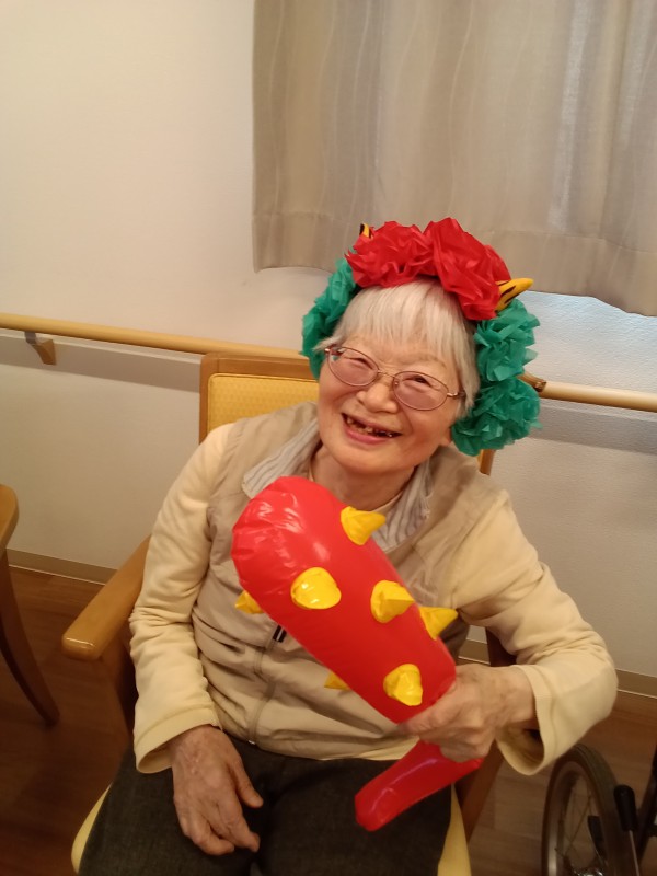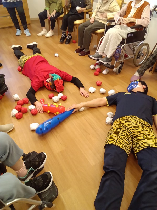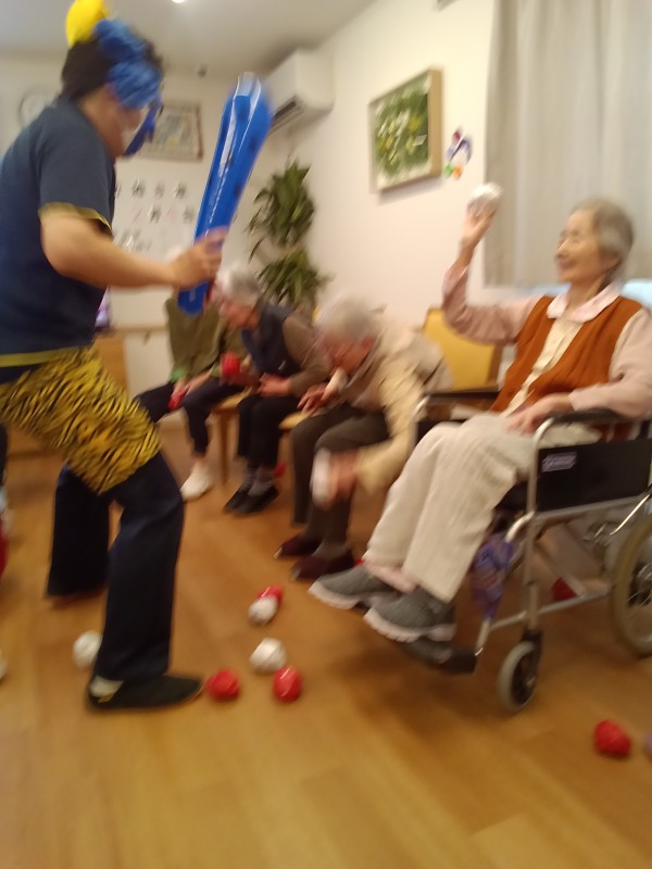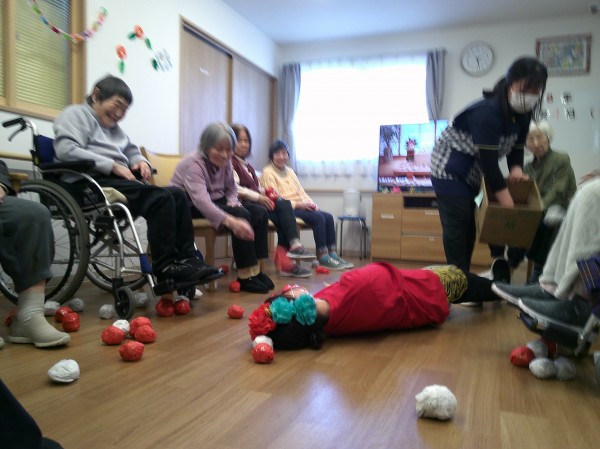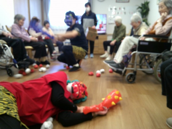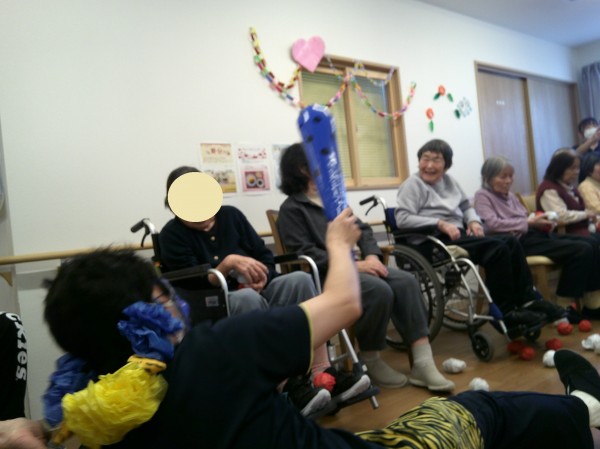 と、本当に18名のご利用者様皆様全員が、びっくりするくらい思いっきり鬼に玉をぶつけたり、投げたり、鬼の金棒を取ってお尻ぺんぺんしてきたりと、ここぞとばかりにやり切って下さり、楽しんで下さっているご様子が見受けられました。