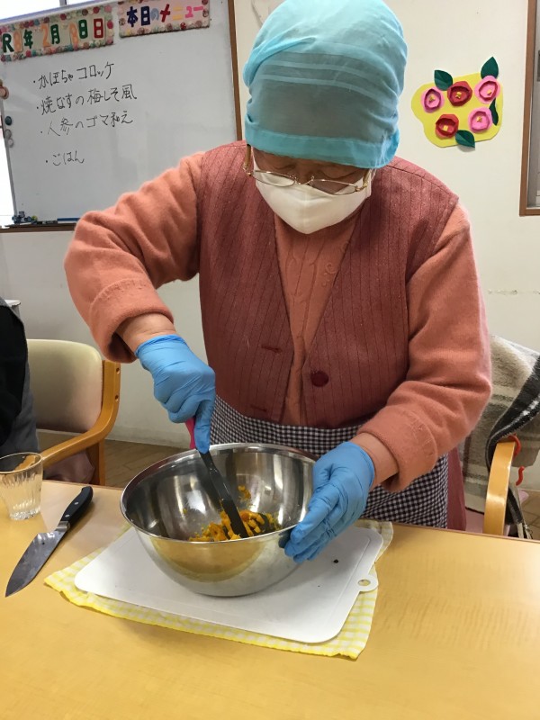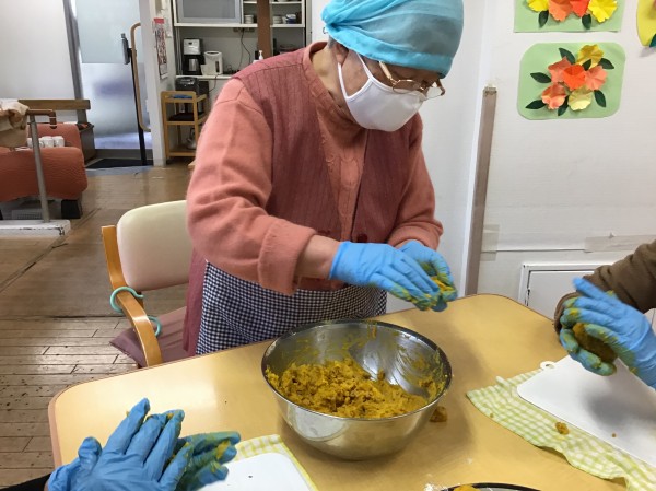 今度は、ゆでたカボチャをつぶしましょうね(^_-)-☆