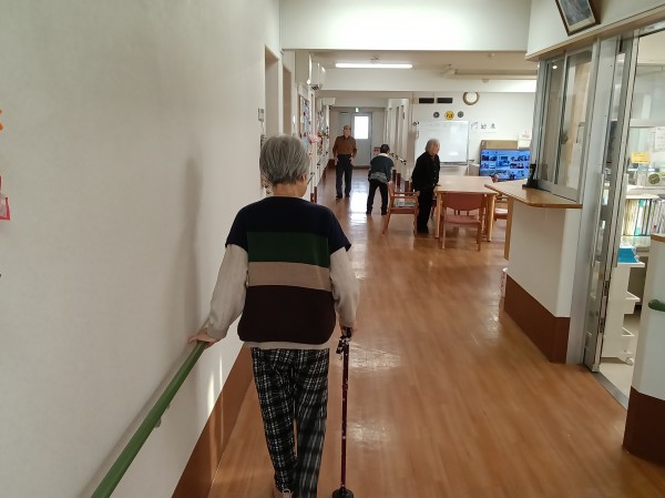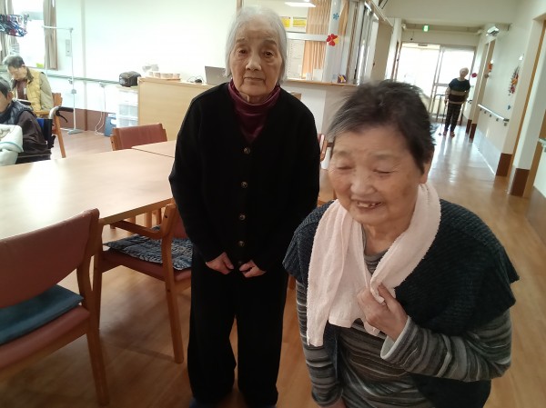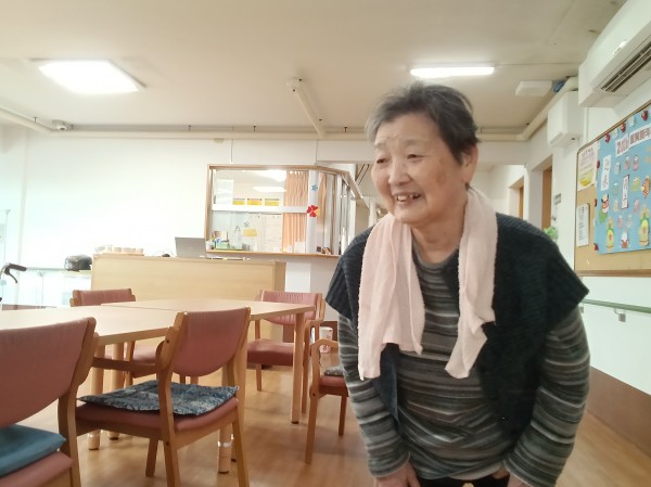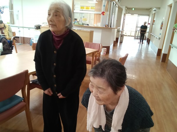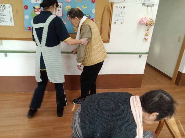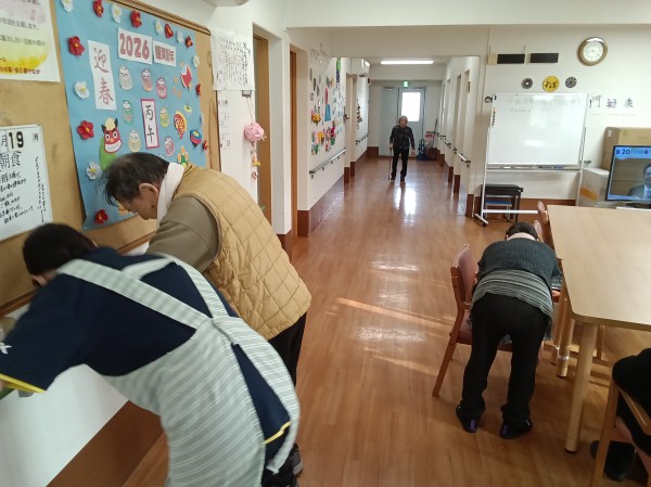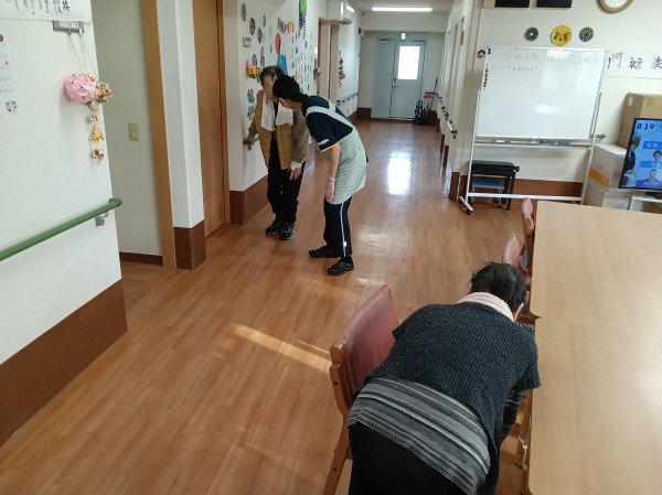 笑顔で朝活中の入居者様を応援・盛り立てます。これも朝活。