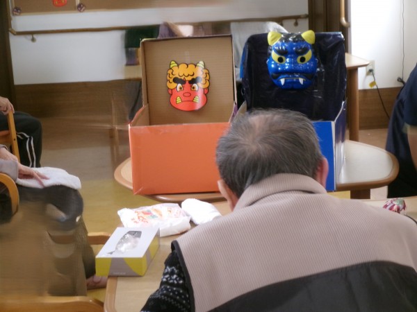 少し遅めですが、豆まき(投げているのはお手玉ですが)
