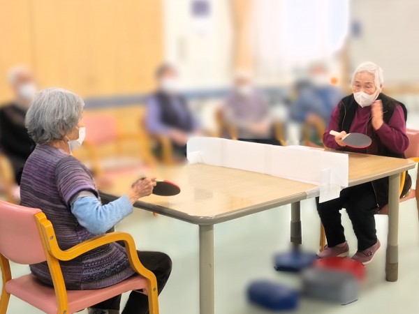職員お手製の仕切りボードをネット代わりにテーブルに設置してピンポン玉を打ち合っていただきました♪