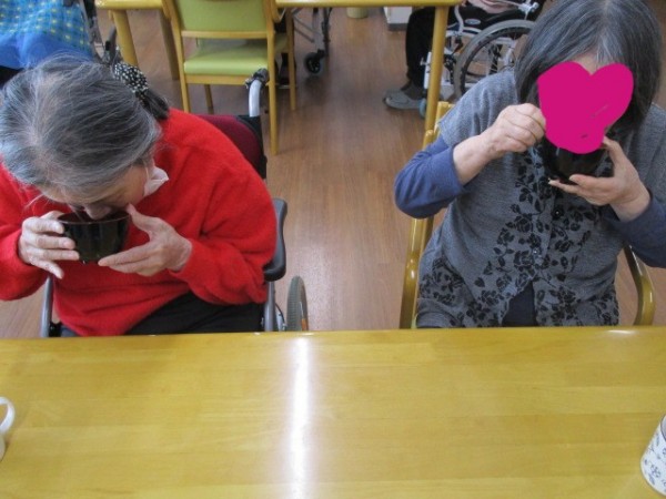 今日は2階でお汁粉のおやつを作りました。 召し上がられているご様子をお知らせいたします!!