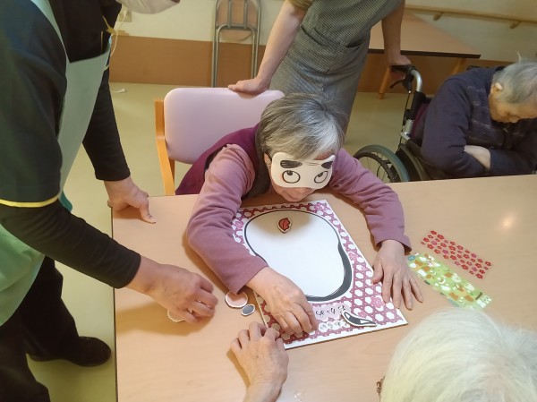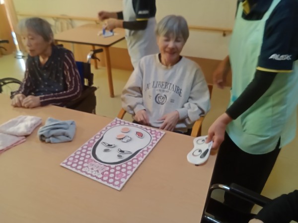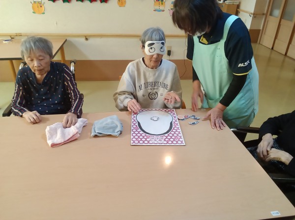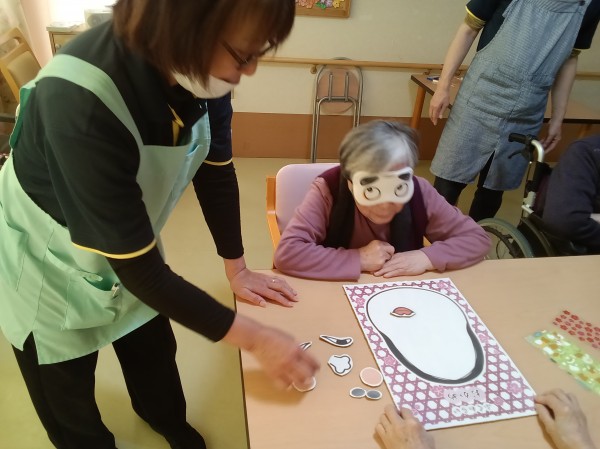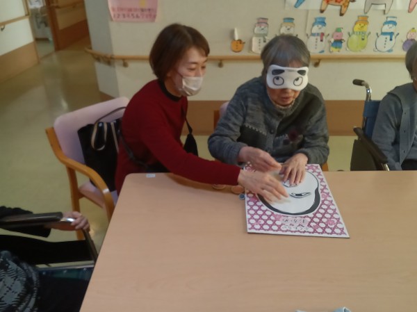 1月の新年会で伝統的なお正月遊びの「福笑い」を入居者様と一緒に楽しみました。