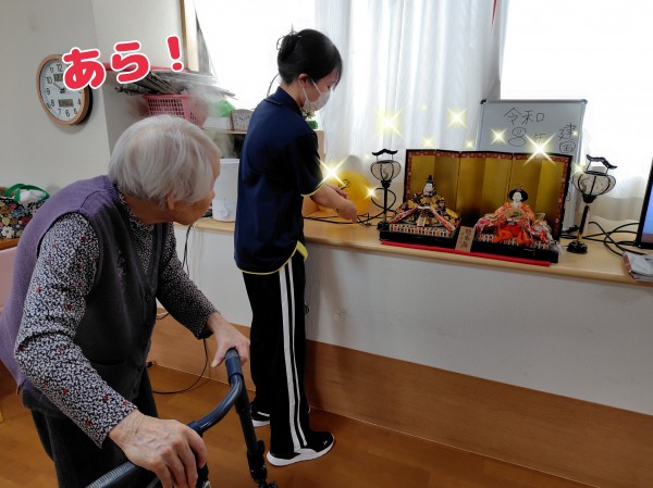 『本当に可愛いよ。まるで、あなたみたいに可愛いお雛様だね!』と、飾ってくれた川畑ケアリーダーとおしゃべり♪