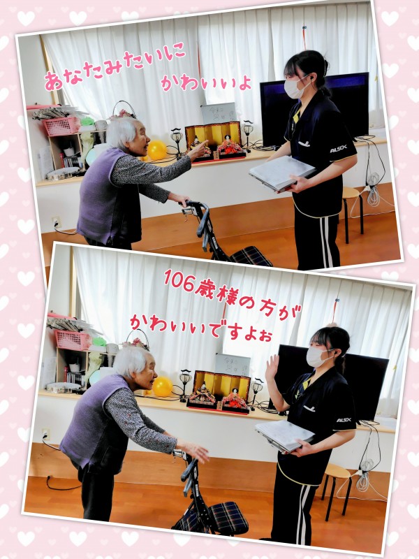 『そんなことないですよ〜、可愛いのは106歳様とお雛様ですよぉ〜』と照れる川畑さん(笑)