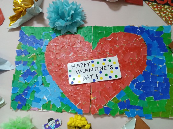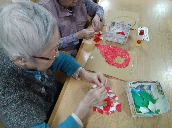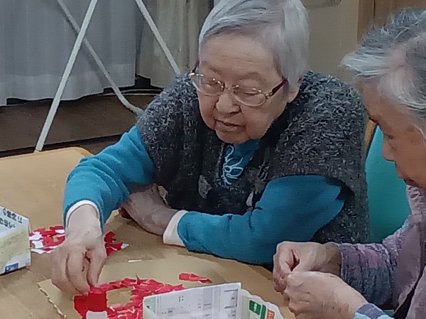 1階では「ハート」♡の貼り絵を作成中です。