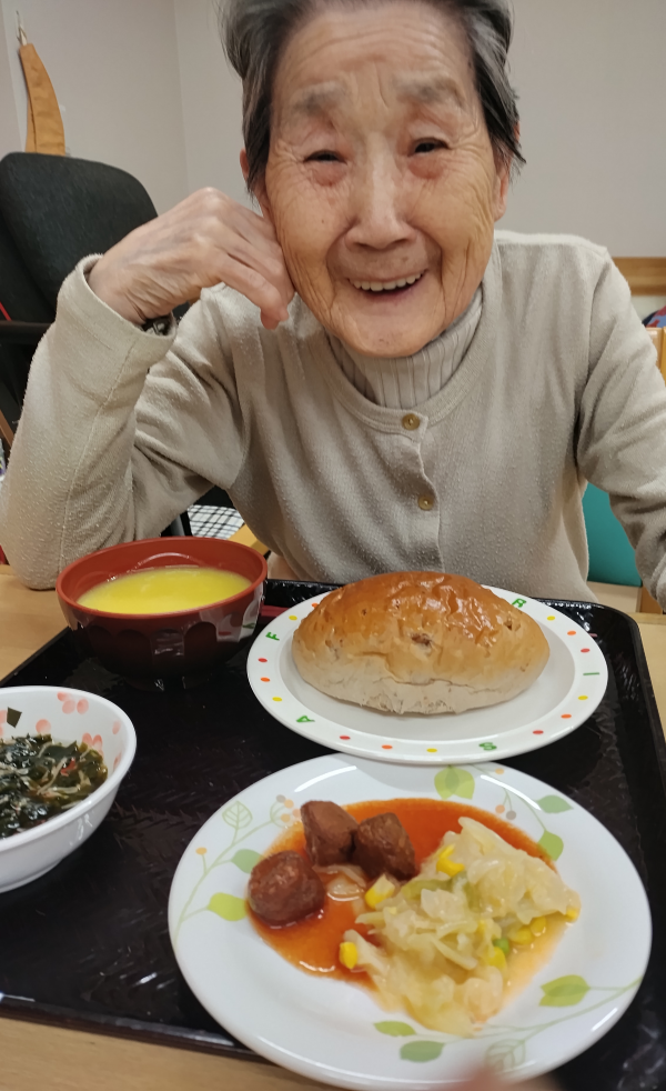 朝食時ふかふかのくるみパンを召し上がりました!少しずつちぎって食べるね!コーンスープとも合い美味しいと喜ばれました(*´u` *)モグモグ