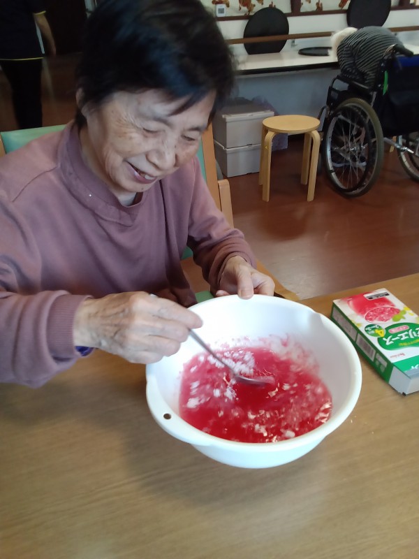 この日のスイ-ツは手作りゼリーで、入居者様に作っていただきました