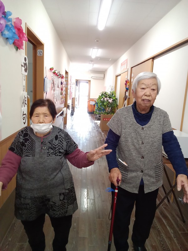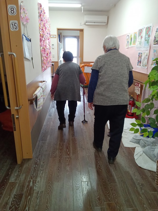 昼食後には数名の利用者様は自発的に足腰強化の為に、施設内の廊下をスタッフ付き添い又は見守りのもと歩いています。