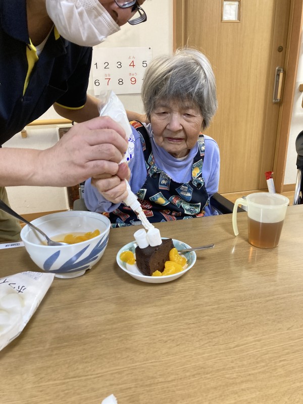 チョコレートケーキに各々みかん・マシュマロ・ホイップクリームをトッピングして頂きました。