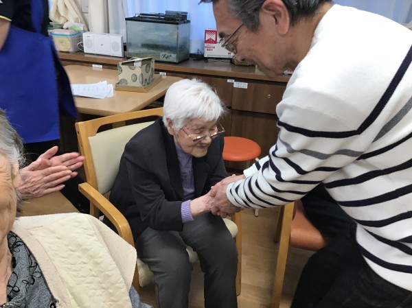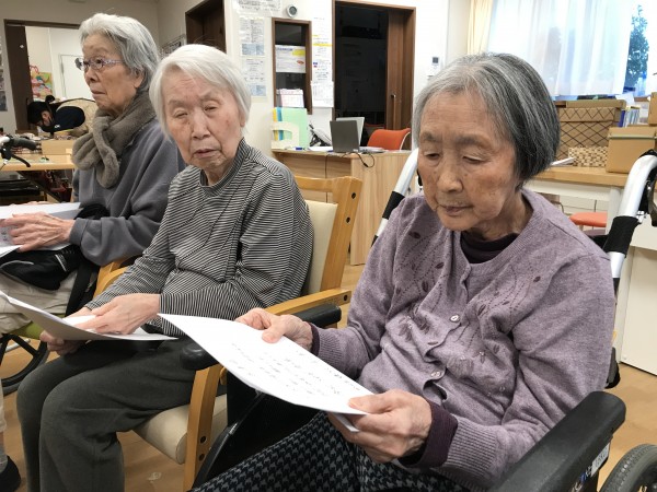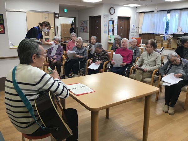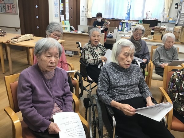 今回の歌詞カードは、ご家族様が手書きで準備してくださいました(ありがとうございました)皆さんも歌詞カードを見ながら歌を唄ったり「昭和〇年の歌なんですよ~」という紹介では「まだ私は生まれてないわ~」という声も飛び出したりしていました。