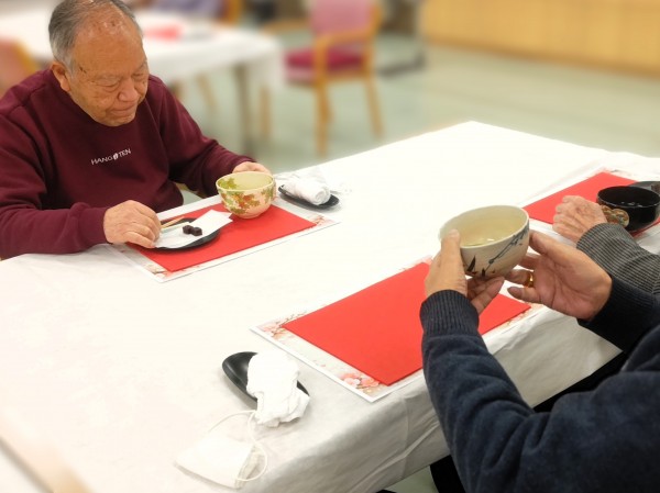 初めに老舗和菓子店虎屋の羊羹「夜の梅」を食べて頂き、そのあと、同じく虎屋の抹茶「京の調」を提供いたしました。