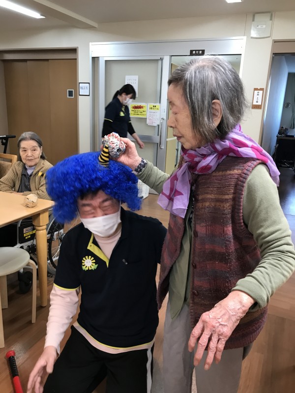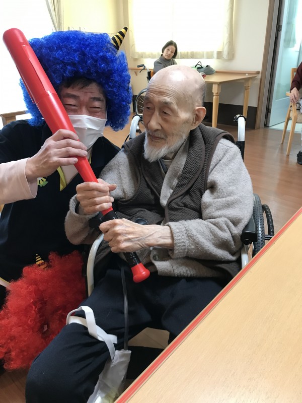 鬼に豆(新聞紙)を投げたり、金棒を奪って追い出しました。