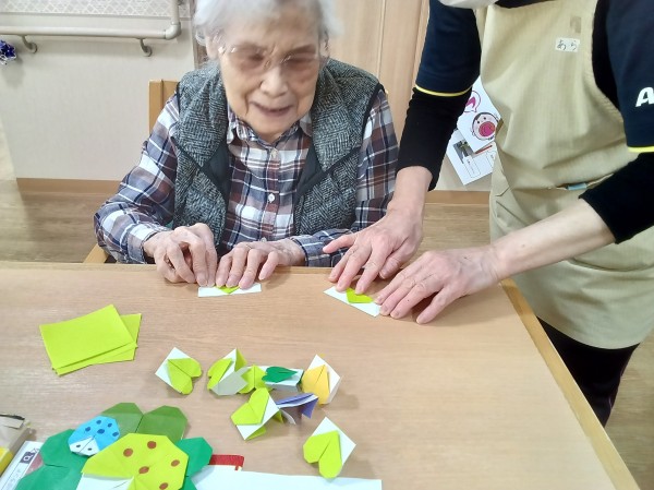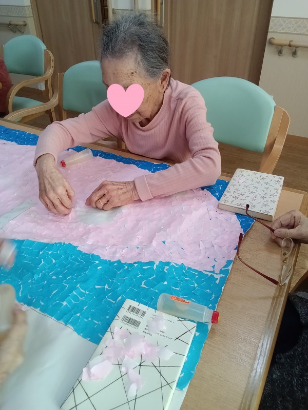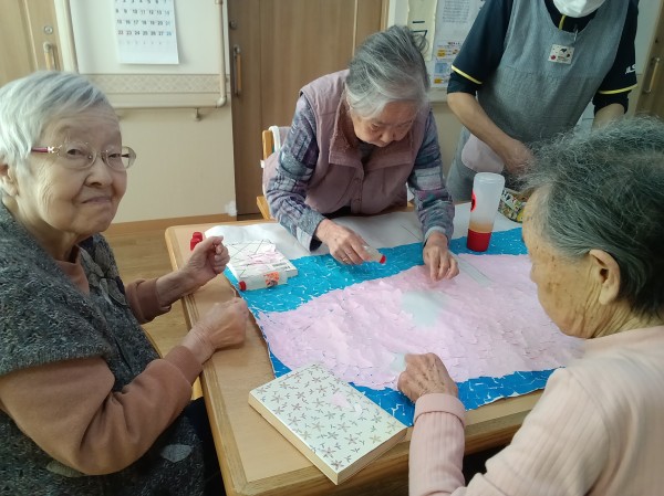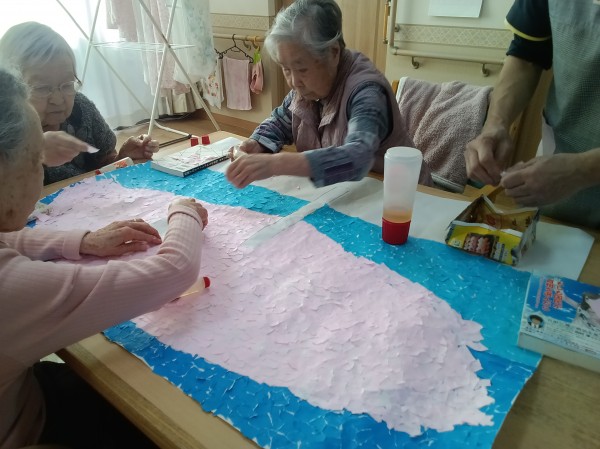 各フロアで春の壁飾り作りが始まっています。