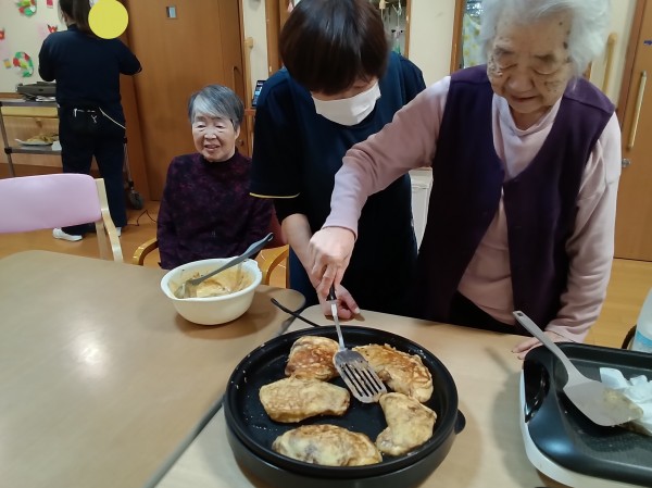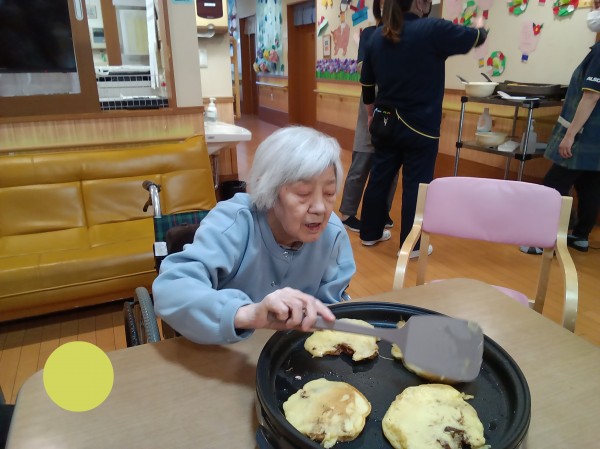 ホットプレートを囲み、数名のご利用者様に「ひっくり返し」をお願いしたところ、「任せて!」とお見事な手つき♪