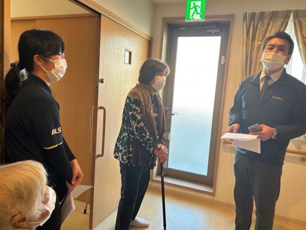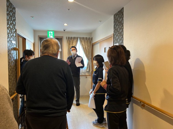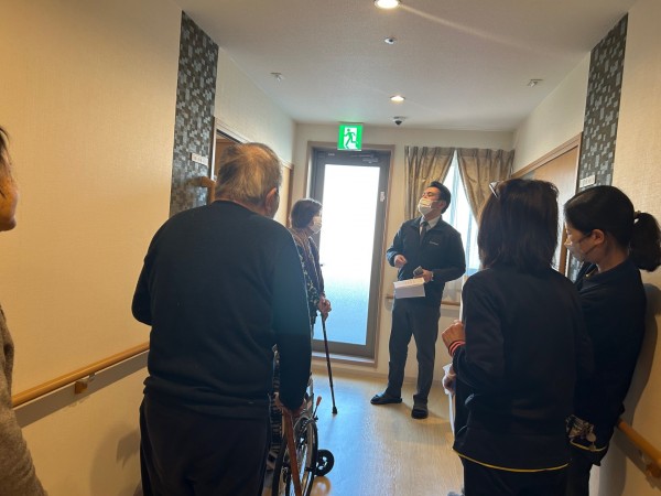 避難後は施設長より、避難通路や設備について説明があり、入居者様も真剣な表情で聞かれていました。