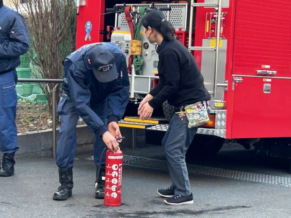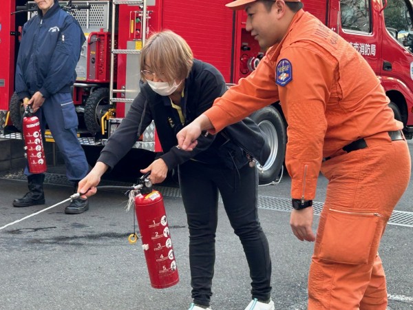 実際の消火器を使用し、隊員の皆様のご指導のもと、使い方や消火の手順を一つひとつ丁寧に教えていただきました。
