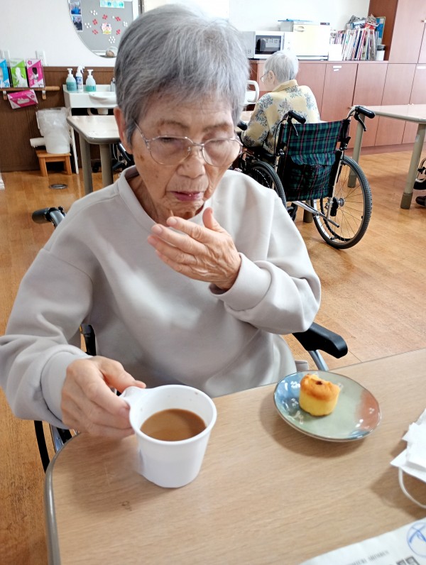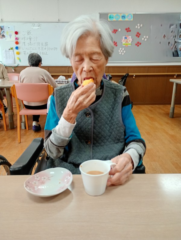 本日のおやつは利用者さんのご家族から頂いた川越銘菓のスイートポテトの〃べにあかくん〃でした。
