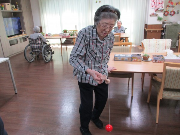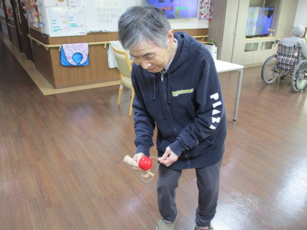 「けん玉なんて久しぶりだからできるかしら~」と自信なさげにお話しされるご利用者様でしたが、何回か挑戦するとコツをつかんできたようで、慣れた手つきでひょいっと皿に玉を乗せておられました(^^♪