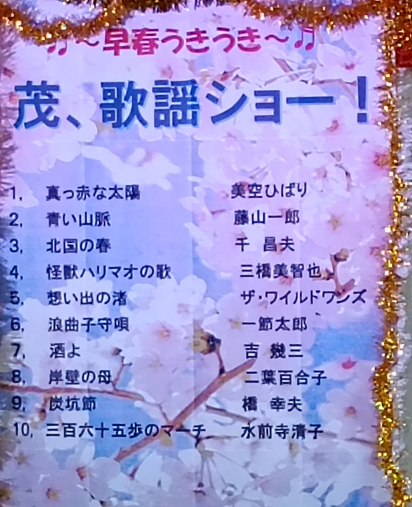今月は、「真っ赤な太陽(美空ひばり)」、「北国の春(千昌夫)』、「炭坑節(橋幸夫)」、「三百六十五歩のマーチ(水前寺清子)」等の曲を歌って頂きました。