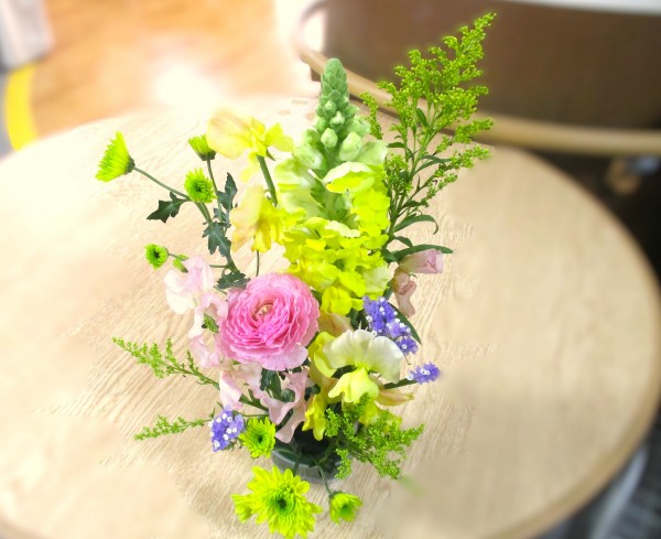 スプレーマム、スイートピー、キンギョソウ、ソリダコ。そこに紫のスターチスを添え、中心にはやさしいピンクのラナンキュラス。黄色のグラデーションが広がる中に、ふんわりと咲くラナンキュラスがやわらかな存在感を放ちます。キンギョソウがすっと高さを出し、スターチスの紫がアクセントとなり、全体がぐっと引き締まった春らしい作品に仕上がりました。「春らしくていいわね」「とっても素敵」完成した作品を前に、皆様の表情もパッと華やぎます。
