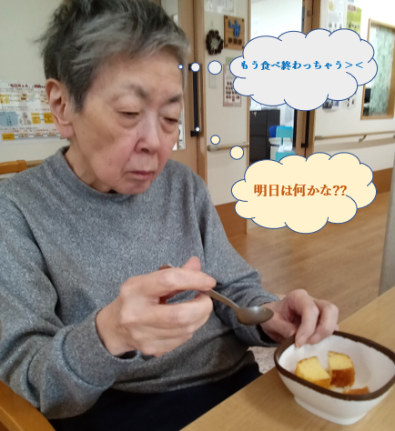 黙々と召し上がる方やご入居者様同士で「美味しいねぇ~」と おやつ時間を楽しまれる方も。