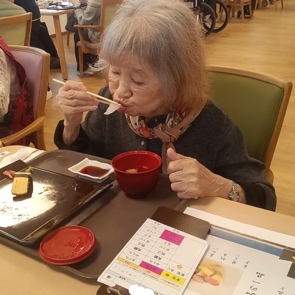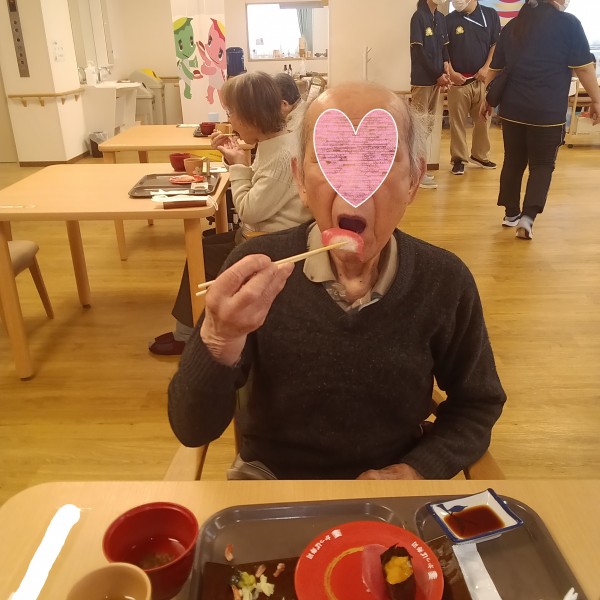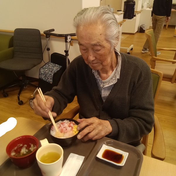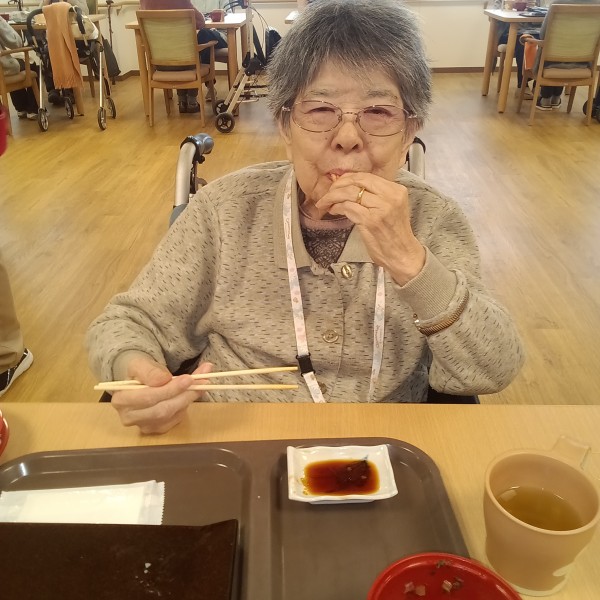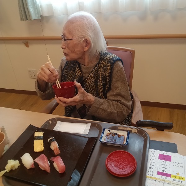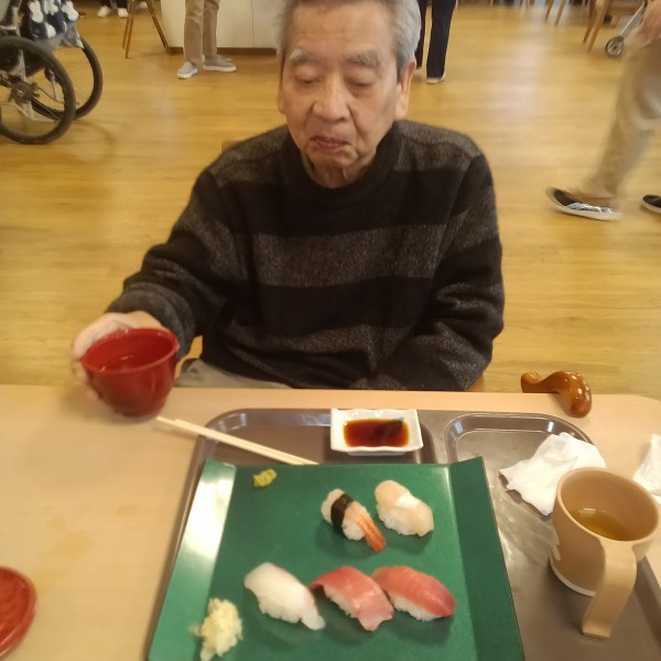 「ねぇ、〇〇さん(ホーム長)。お寿司の時の飲み物ってなあに?」