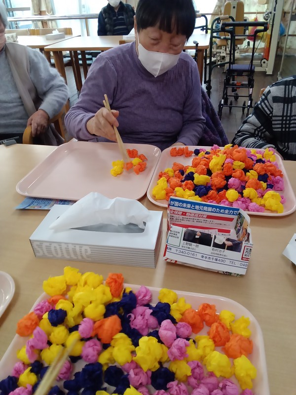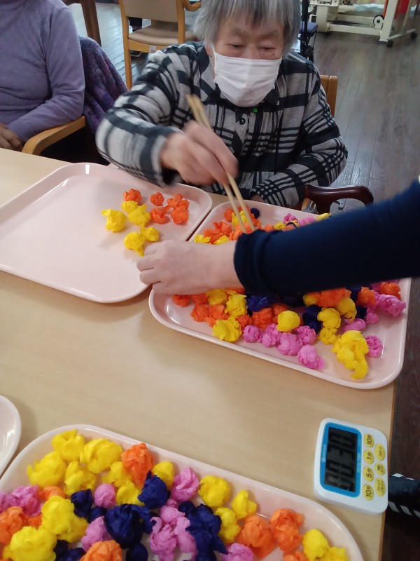 手のリハビリにもなるのでお箸を使うレクリエーションは継続していきたいと思います。