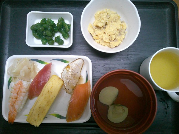 五種類の握り寿司・うぐいす豆・豚肉の卵とじ・ハマグリのお吸い物となっております♪